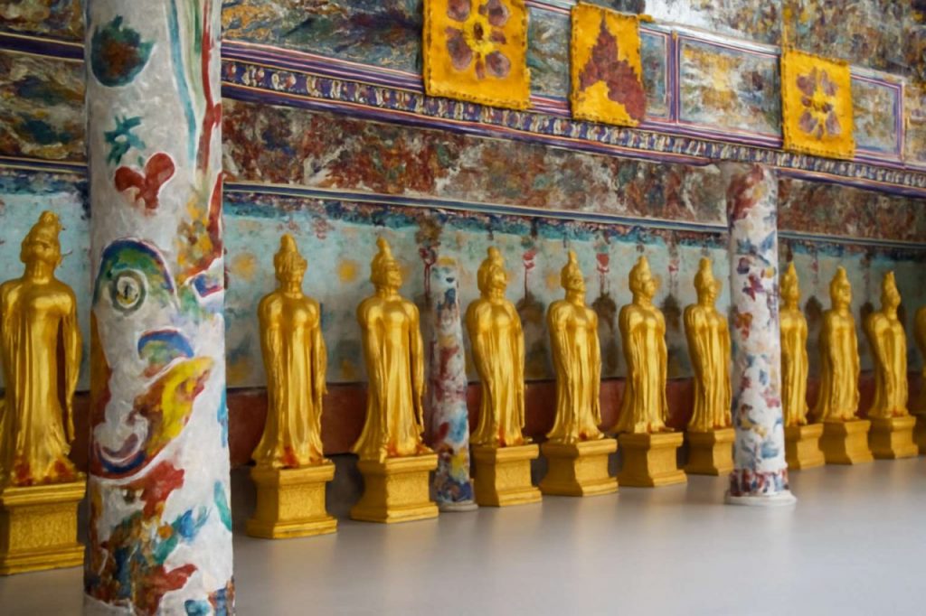 Также в одном из залов, в окружении подданных, возвышается статуя самого Будды в белых одеяниях. Стены зала, как и всей пагоды, отделаны мозаикой, и это не перестает восхищать.